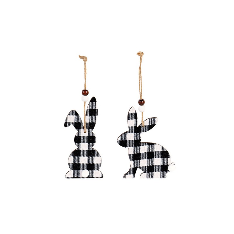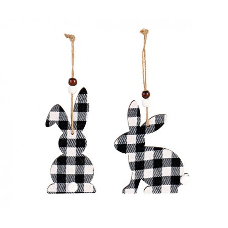 Coniglietti assortiti da appendere con texture a quadretti neri.