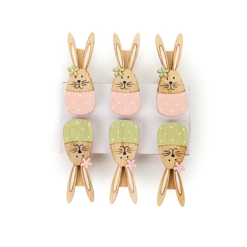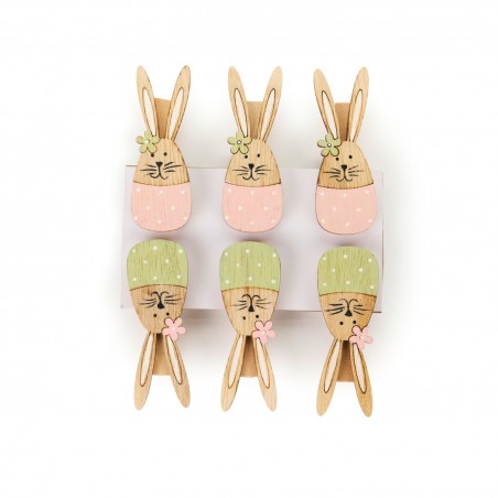 Set di 6 mollette a forma di coniglietti in legno con fantasie rosa e verdi
