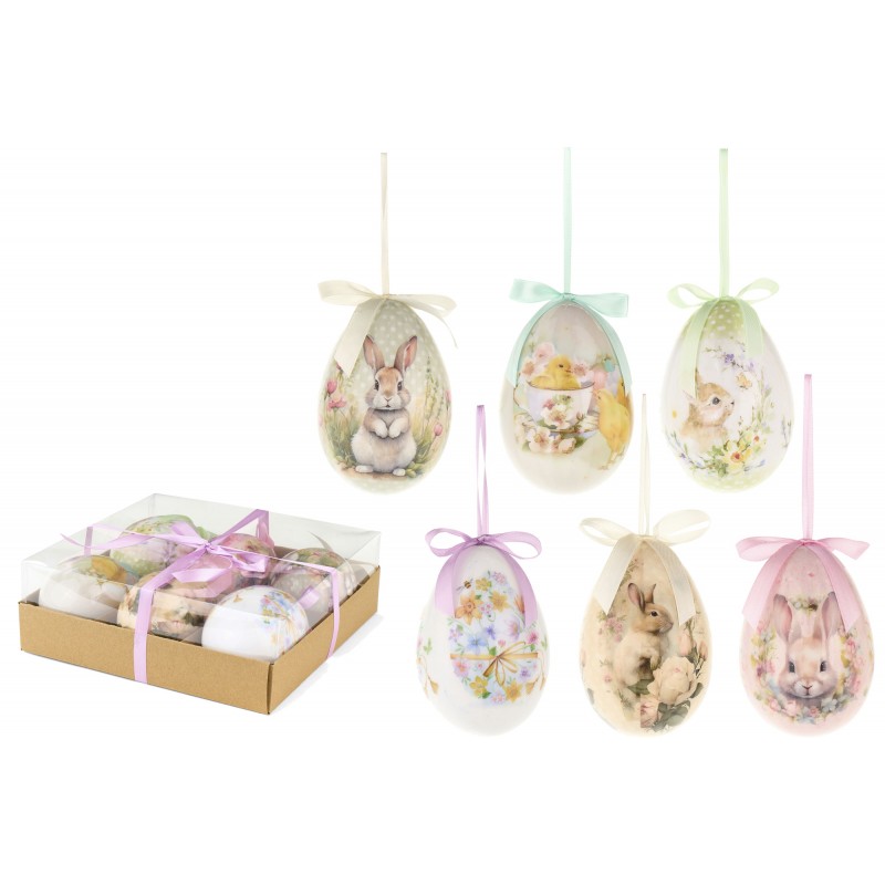 Box con assortimento di 6 uova dipinte con temi floreali e conigli