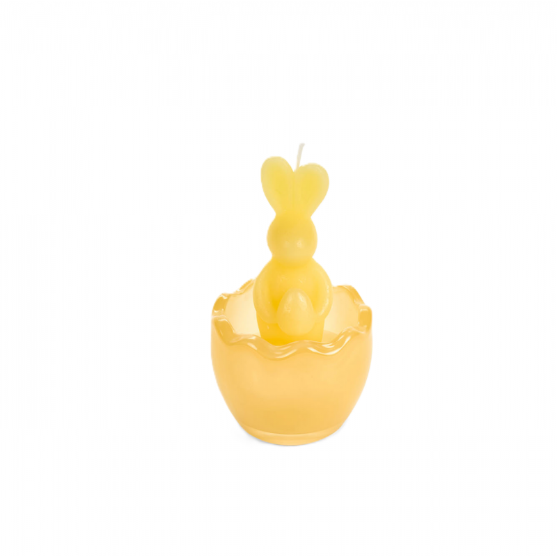 Candela in paraffina colorata a forma di uovo con coniglietto.