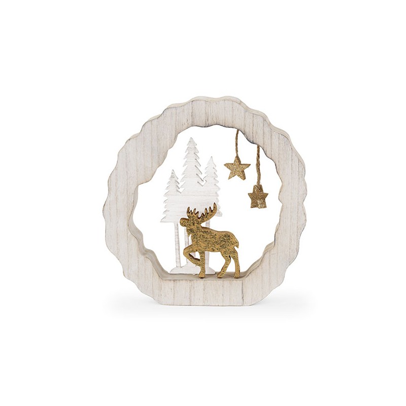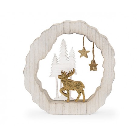 Decorazione natalizia di legno con cervo dorato al centro e alberi sullo sfondo