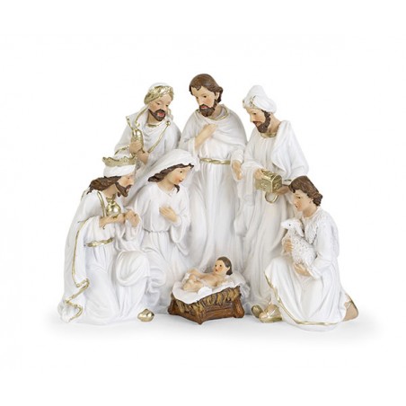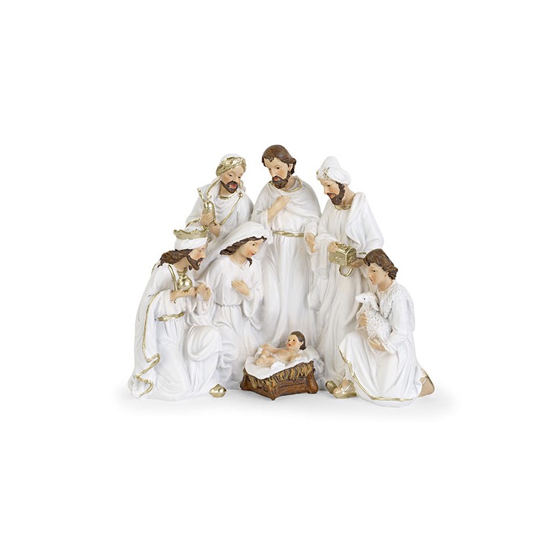 Rappresentazione della natività con i re magi vestiti di bianco.