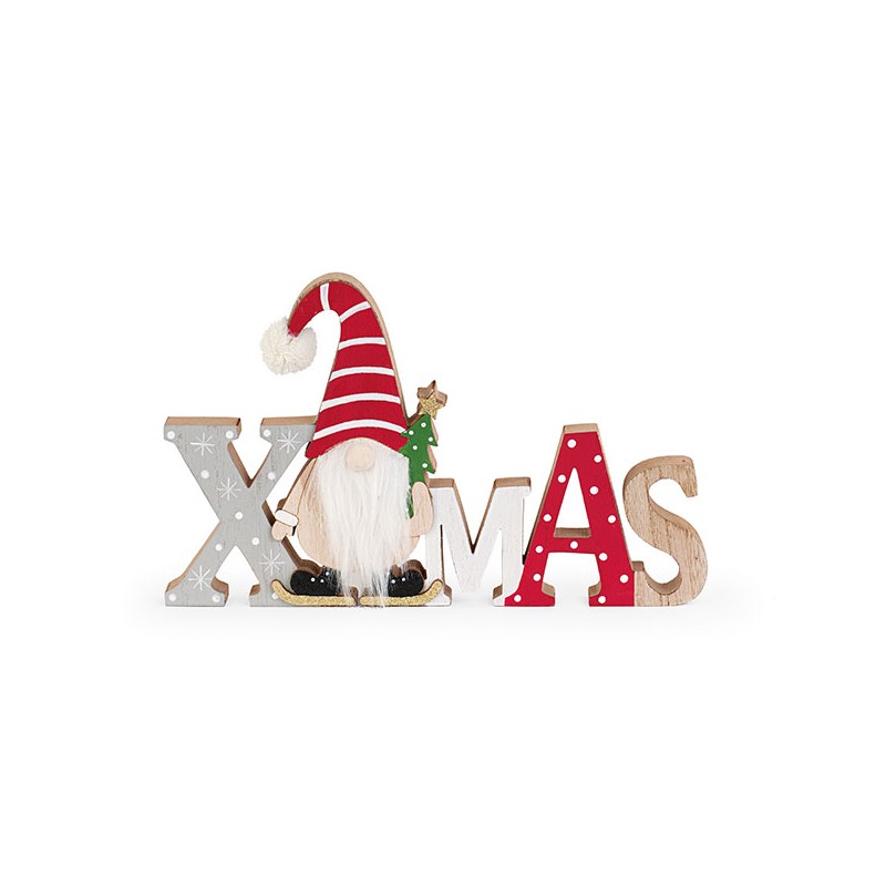 Scritta "Xmas" in legno con gnomo.