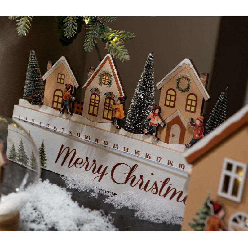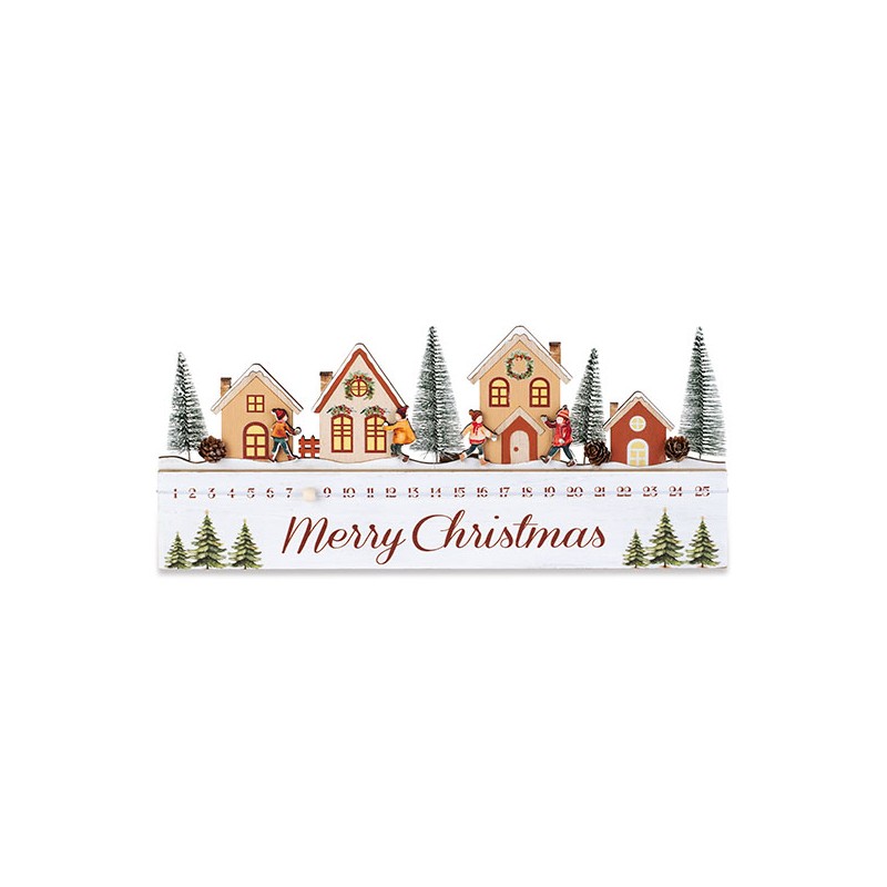 Calendario dell'avvento con villaggio innevato e scritta "Merry Christmas".