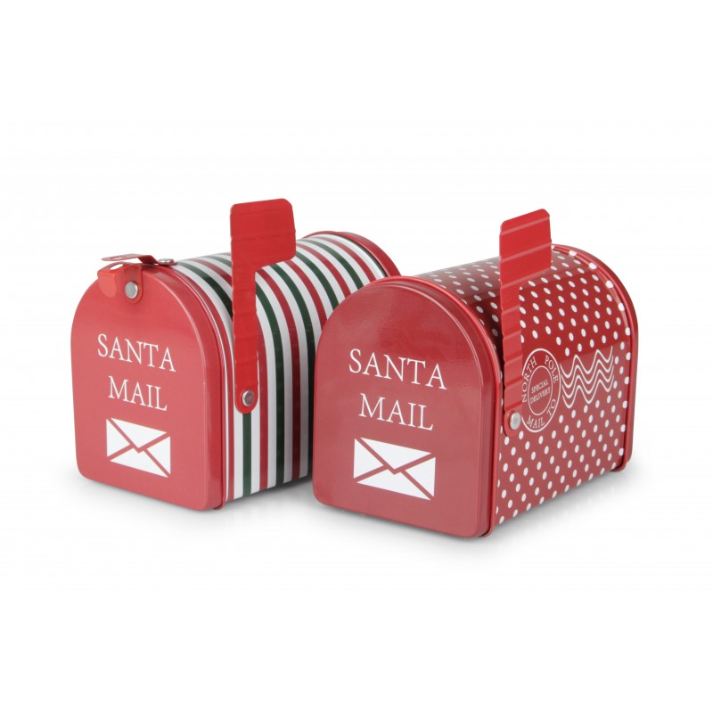 Set di 2 scatole natalizie in metallo colorato a forma di cassetta delle lettere di Babbo Natale.