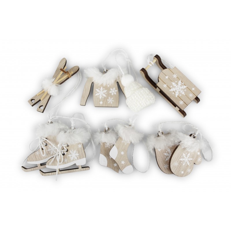 Set di decorazioni assortite a forma di oggetti invernali, come sci, maglioncino, slitta, pattini, guanti e calzini.