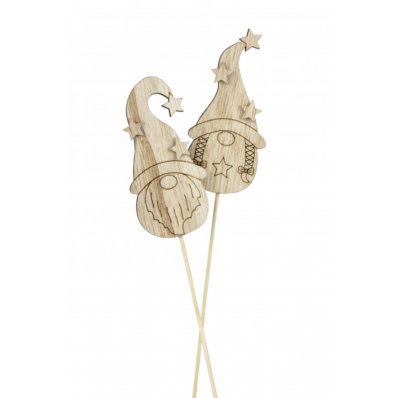 Bastoncino in legno con gnomi di Natale in legno naturale assortiti sulla parte superiore.