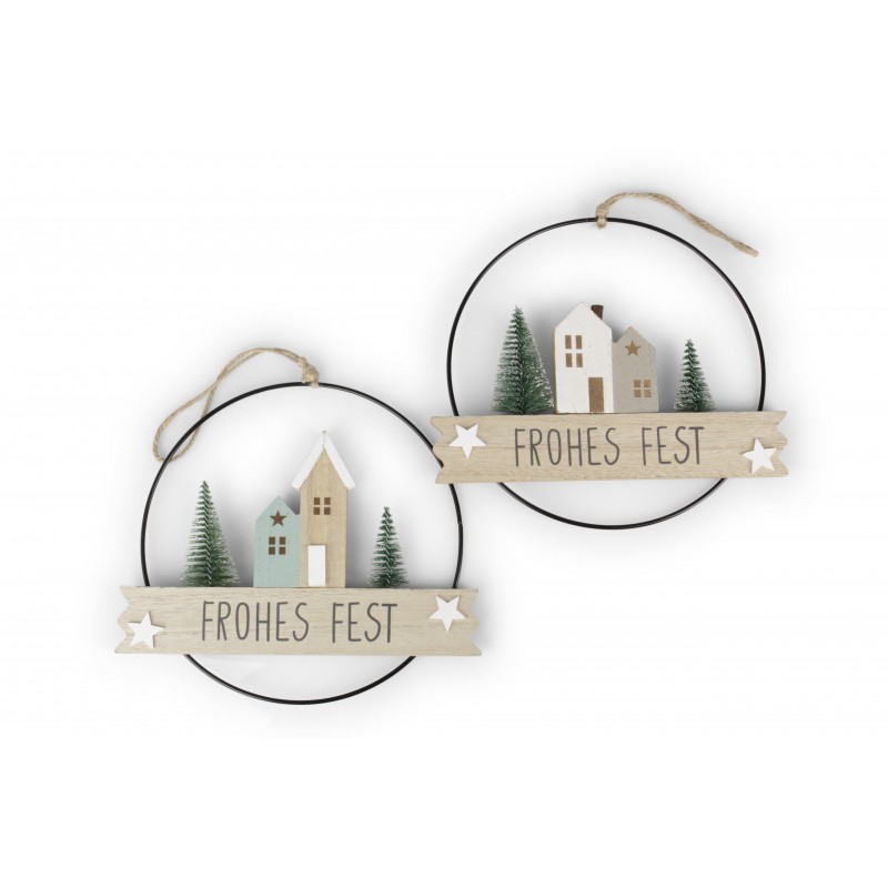 Addobbi a forma di casette di legno con scritte su ghirlande in metallo da appendere.