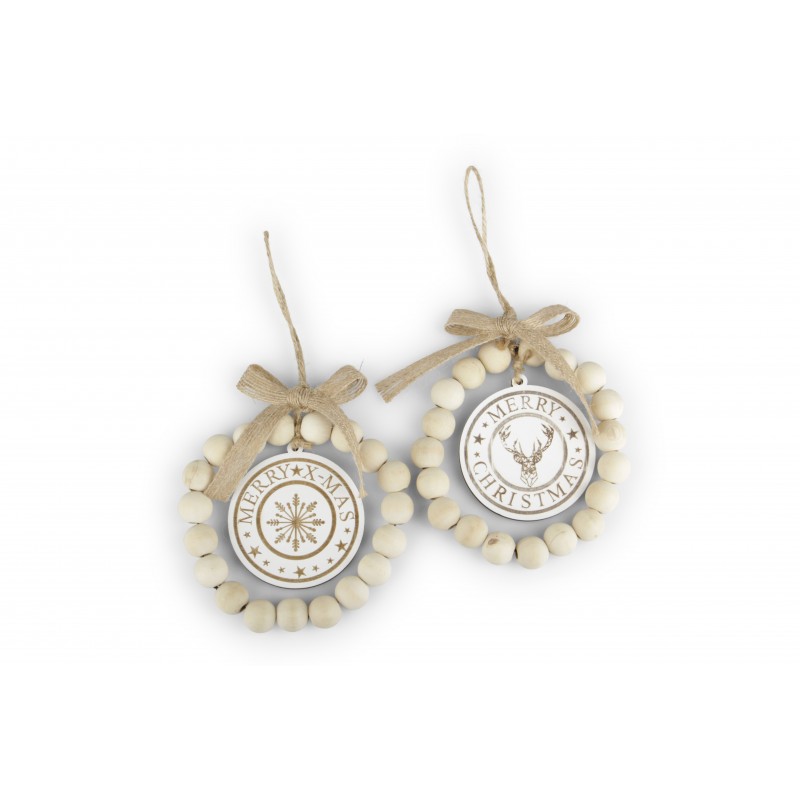 Addobbi a forma di ghirlanda di perla con all'interno soggetti natalizi da appendere.