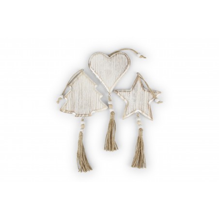 Addobbi a forma di soggetti natalizi in legno da appendere, quali albero, stella e cuore.