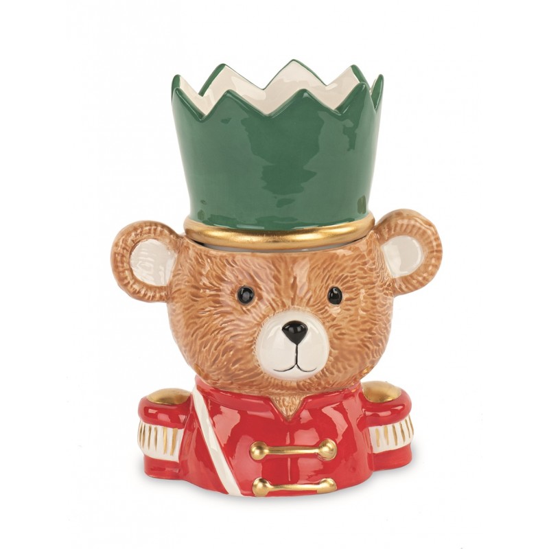 Vaso di ceramica a forma di orsetto soldatino di Natale con tamburello.
