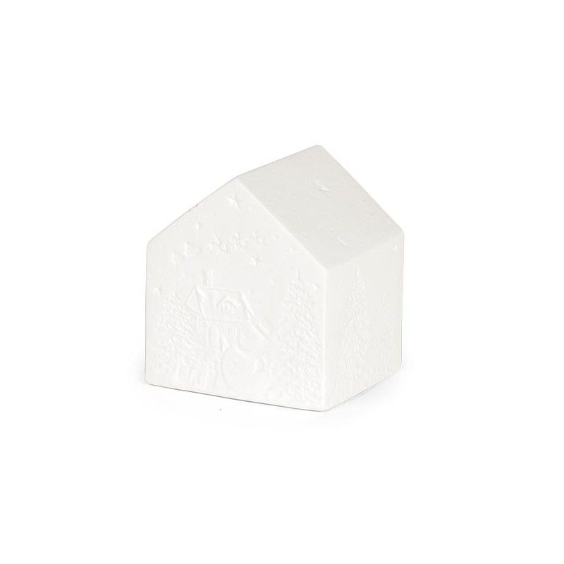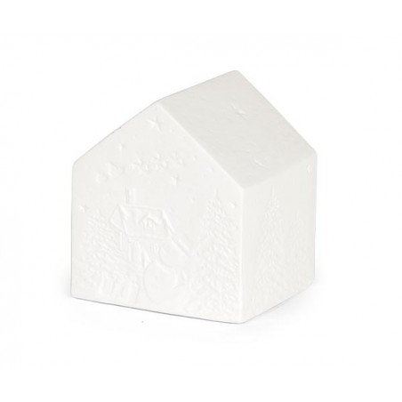 Casetta in porcellana di colore bianco con serigrafia di un villaggio di Natale.