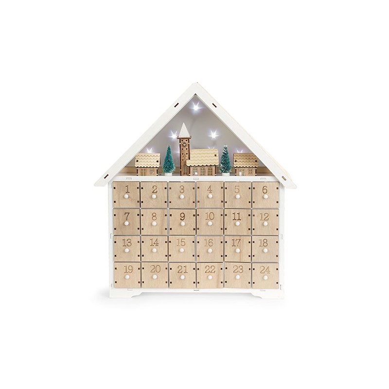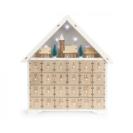 Calendario dell'avvento a forma di casetta con paesaggio natalizio e LED decorativi.