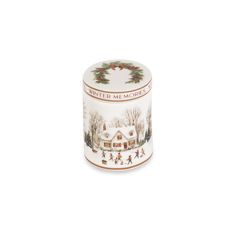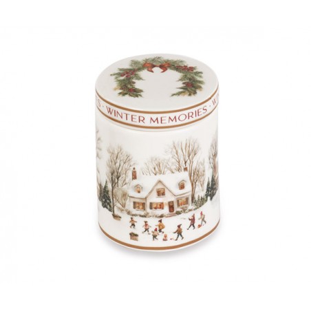 Barattolo con villaggio innevato, scritte Merry Christmas e candela profumata all'interno.
