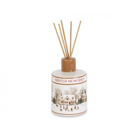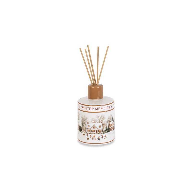 Diffusore a forma di barattolo con villaggio innevato di Natale, scritte Merry Christmas e scatola per il confezionamento.