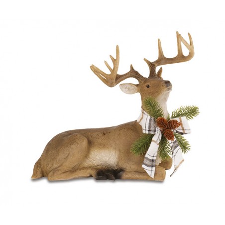 Statua di cervo seduto con i suoi colori naturali e fiocco tartan.