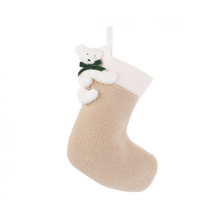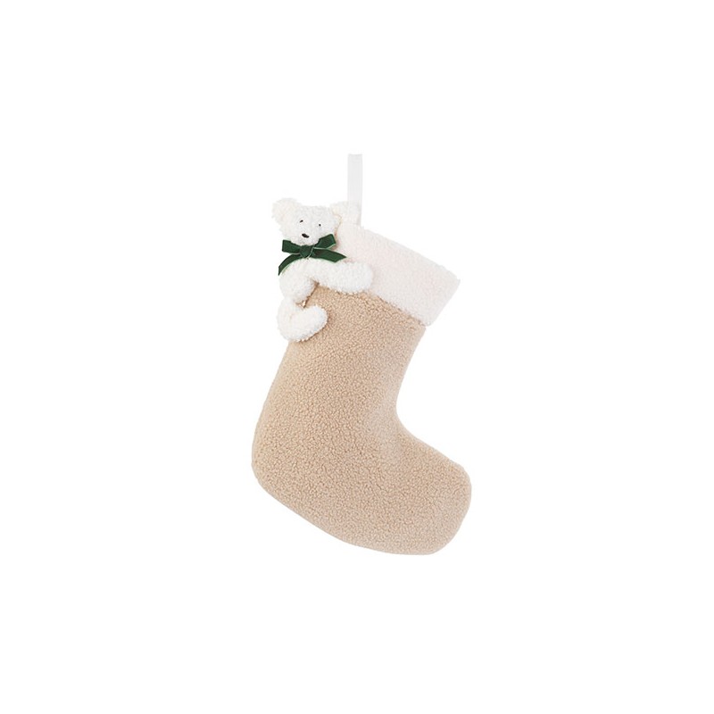 Calza in tessuto colorato con un orsetto di peluche bianco.