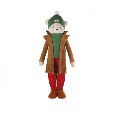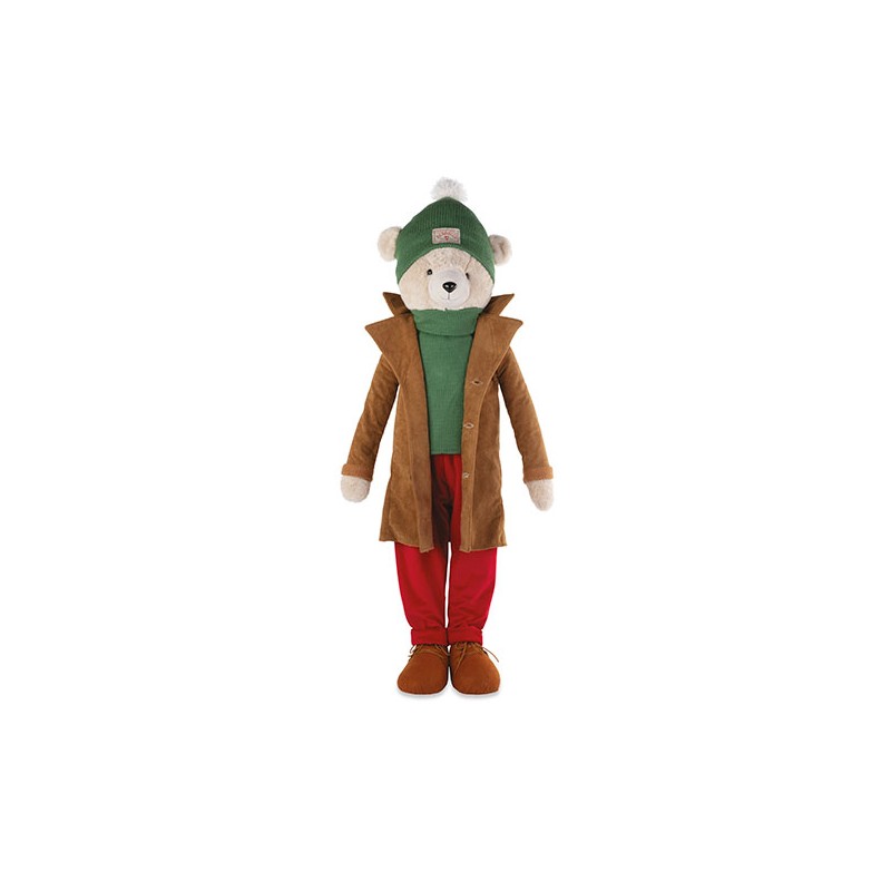 Orso in piedi con gambe telescopiche, cappotto rosso e cuffietta