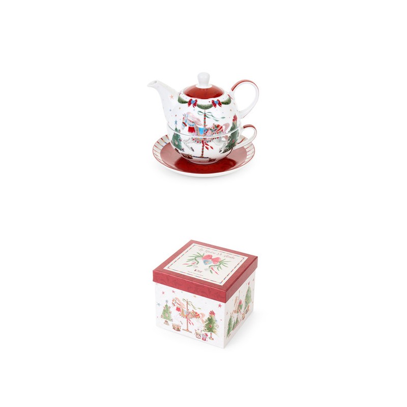 Set completo da thè per una persona, include una tazza e una teiera con disegni natalizi in stile retrò.