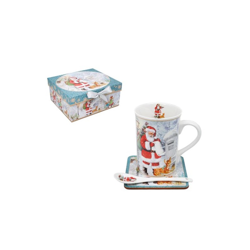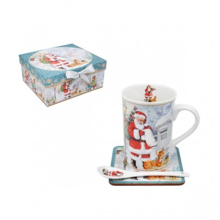 Tazza con disegno di Babbo Natale con cucchiaino e piattino.