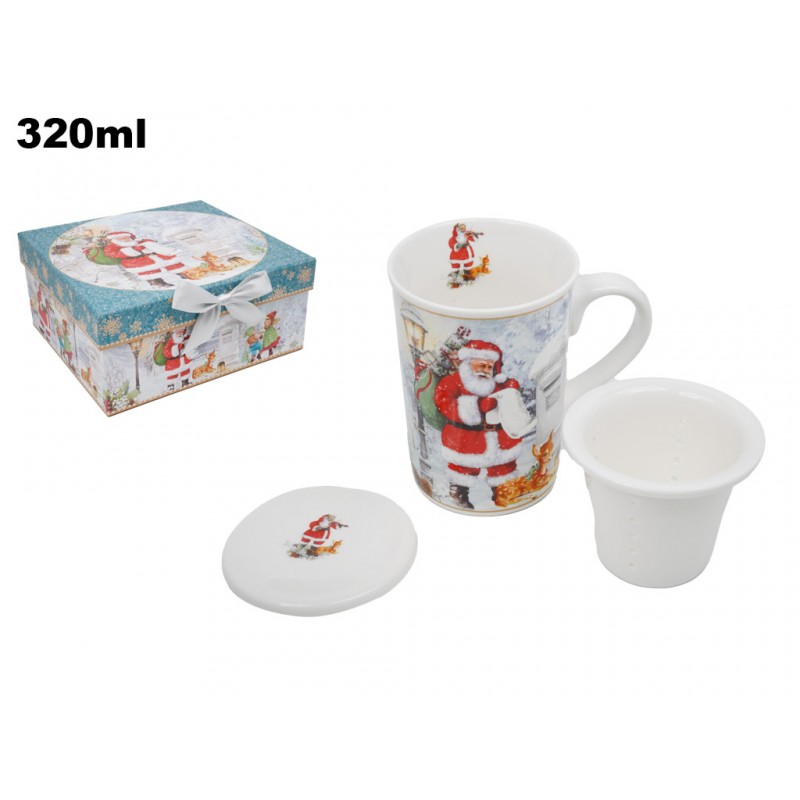 Tazza con disegno di Babbo Natale con filtro per tisane e coperchio.