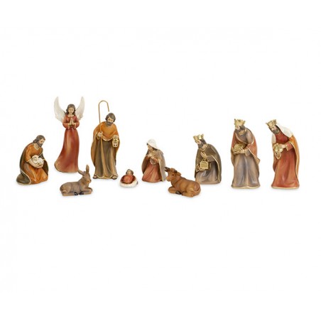 Natività in resina con 11 pz proporzionata per l'altezza di 13 cm, dipinta a mano e composta da Sacra Famiglia, 1 Angelo, Re Magi, 1 Pastore con pecora, 1 pecora, Bue e Asinello.
