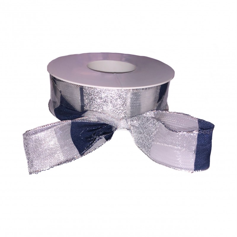 Nastro in cui si alternano tre tipi di filati, un opaco colorato con effetto cotoniero, un lurex e un velato si distribuiscono nel nastro come quadrati.