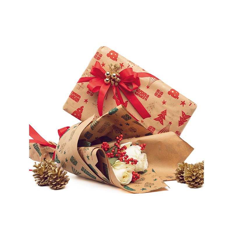 Bobina Natalizia realizzata in carta kraft per confezionare ceste regalo, composizioni floreali o pacchi regalo in generale.