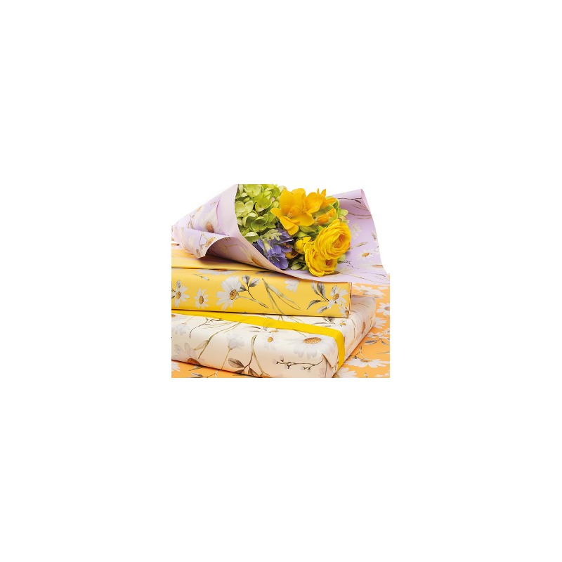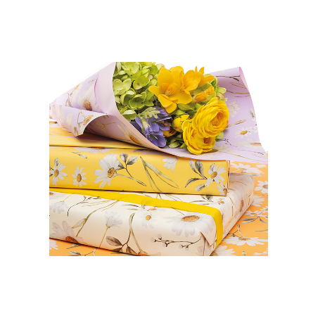 Bobina realizzata in diversi colori in polipropilene perlato stampato per confezionare ceste regalo, composizioni floreali o pacchi regalo in generale.