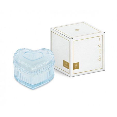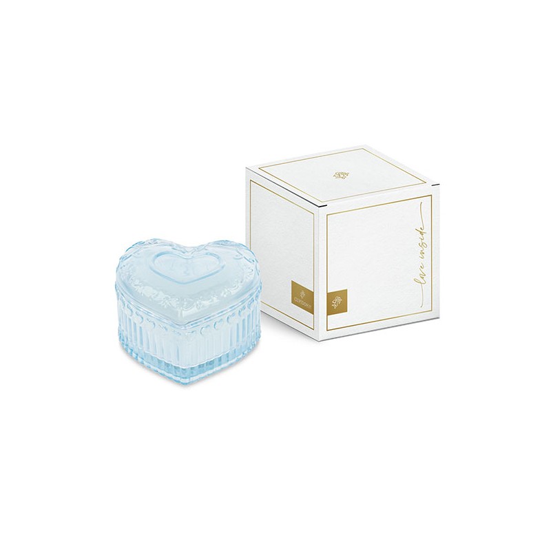 Cuore in vetro colorato con candela profumata e scatola.