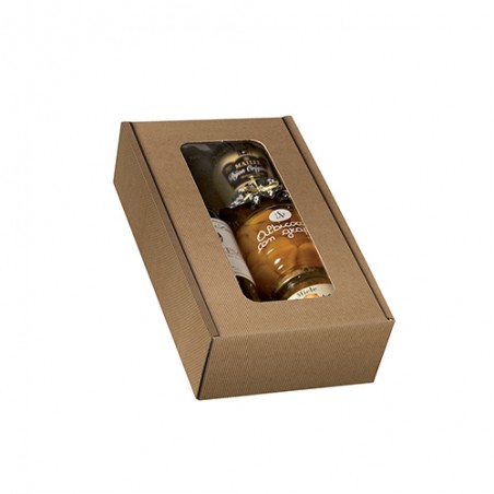Scatola con finestra per confezionare 2 bottiglie stese oppure prodotti enogastronomici vari.