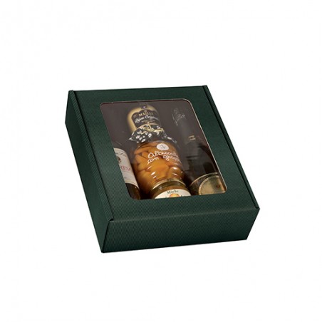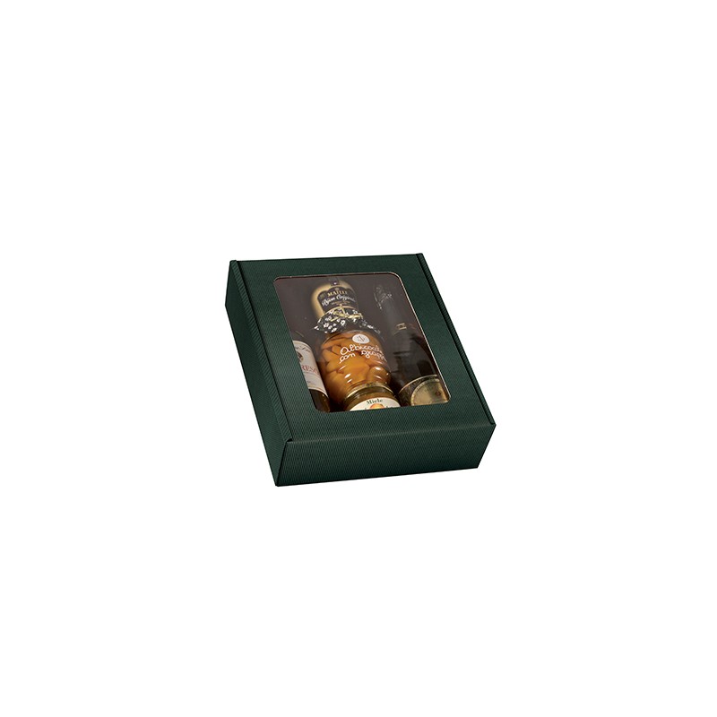 Scatola con finestra per confezionare 3 bottiglie stese oppure prodotti enogastronomici vari.