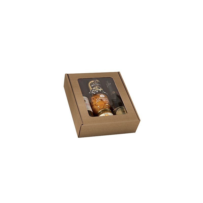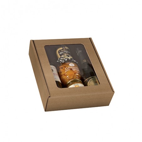 Scatola con finestra per confezionare 3 bottiglie stese oppure prodotti enogastronomici vari.
