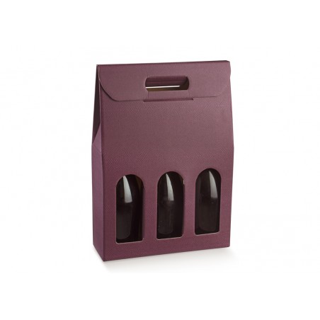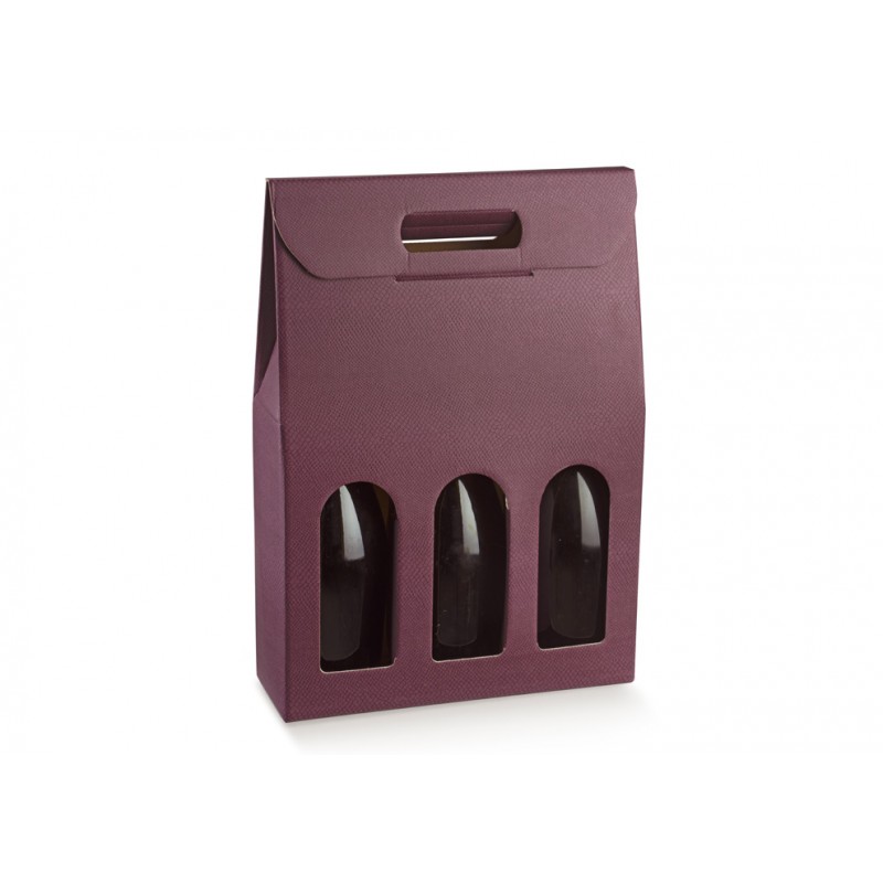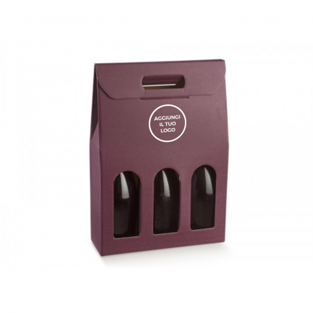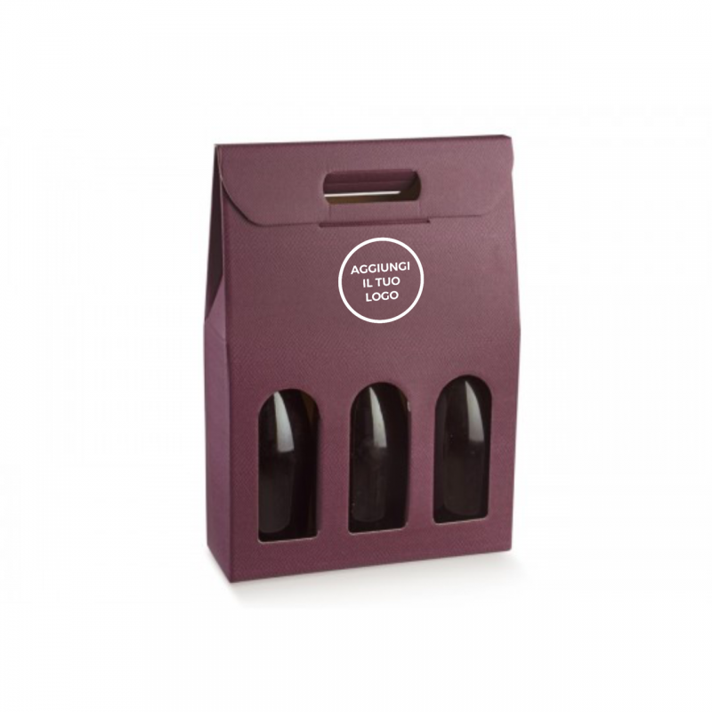 Scatola in cartone accoppiato con maniglia per confezionare 3 bottiglie verticali modello bordolese, borgognotta.