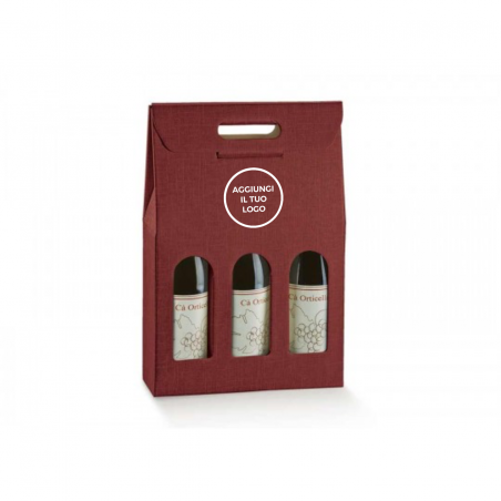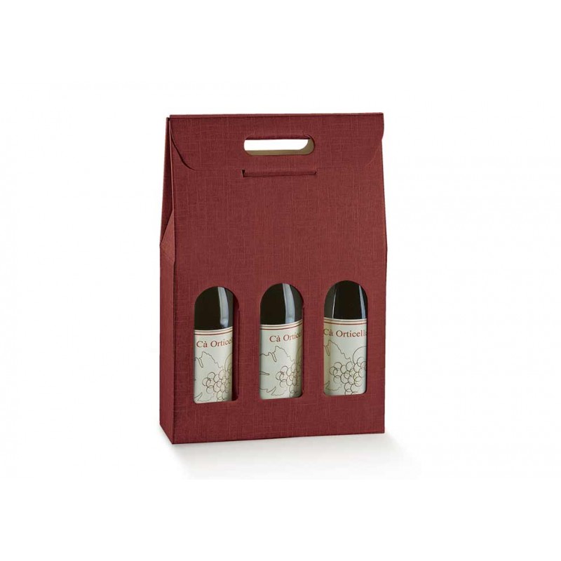 Scatola in cartone accoppiato con maniglia per confezionare 3 bottiglie verticali modello bordolese, borgognotta.