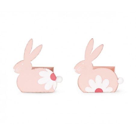 Contenitore metallico di colore rosa con coniglio sulla parte frontale e margherita