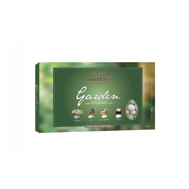 Confetti con mandorla tostata ricoperta da cioccolato bianco o fondente o al latte e alle nocciole gianduia ai gusti assortiti (pistacchio, gianduia, babà con panna e classico) e da un sottile strato di zucchero.