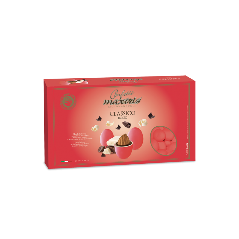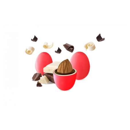 Un confetto con mandorla tostata ricoperta da cioccolato fondente e bianco e da un sottile strato di zucchero.