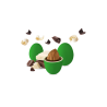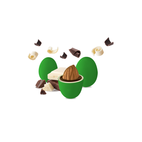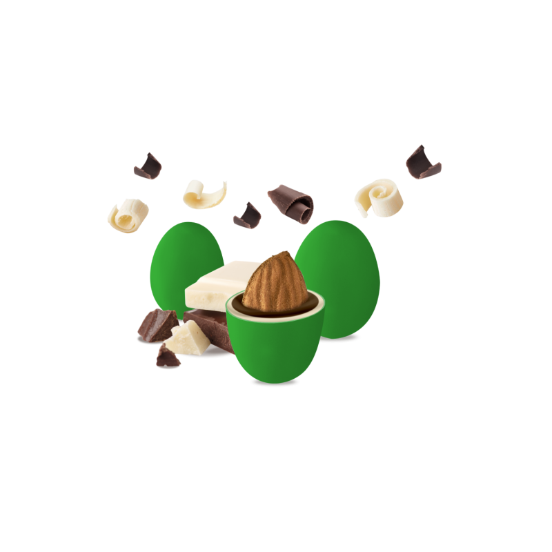 Un confetto con mandorla tostata ricoperta da cioccolato fondente e bianco e da un sottile strato di zucchero.