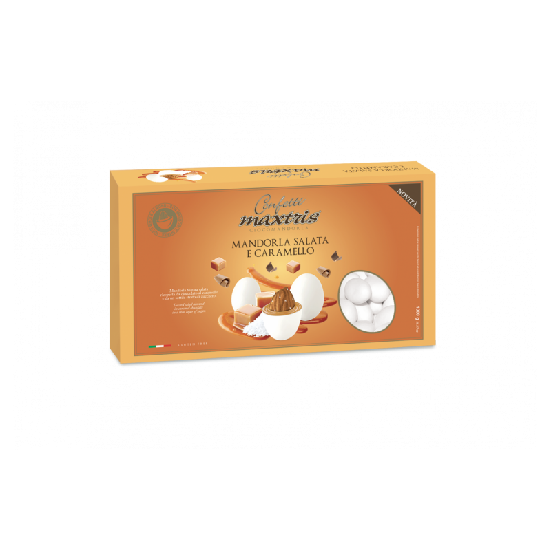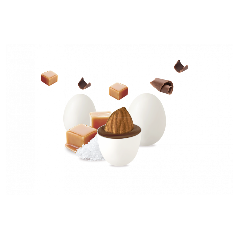 Confetto con mandorla tostata salata ricoperta da cioccolato al caramello e da un sottile strato di zucchero.