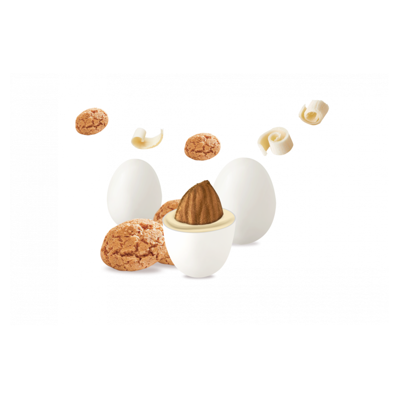 Confetti con mandorla tostata ricoperta da cioccolato bianco al sapore di pasticceria e un sottile strato di zucchero.