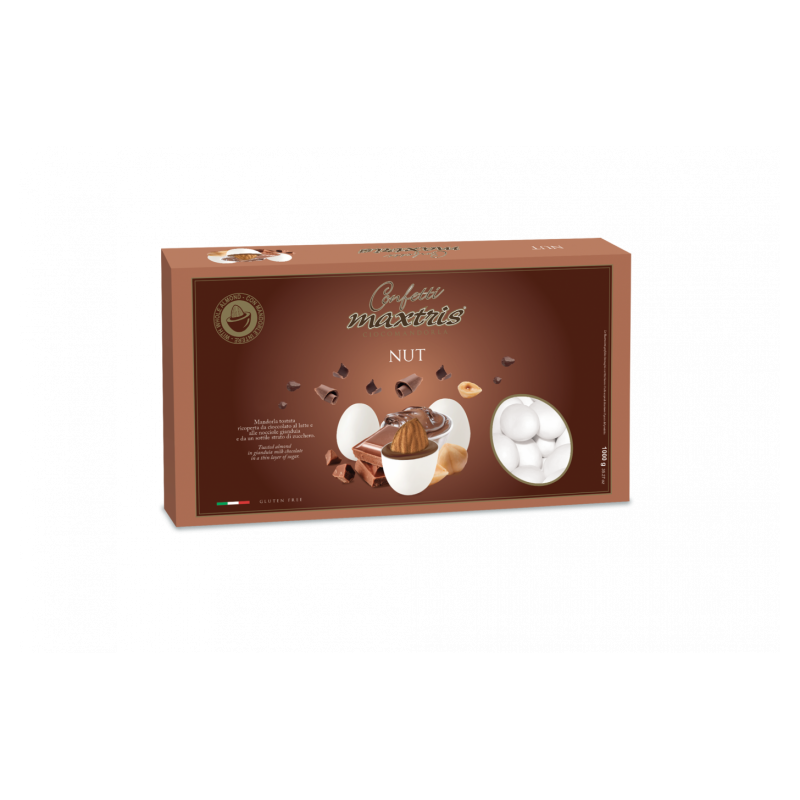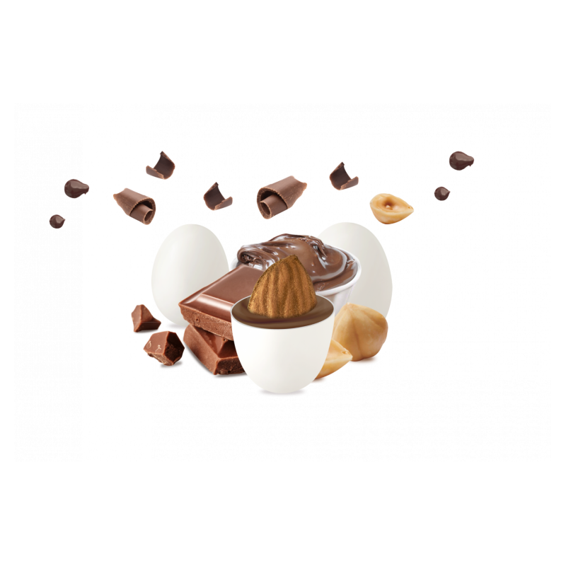 Confetti con mandorla tostata ricoperta da cioccolato al latte e alle nocciole gianduia e da un sottile strato di zucchero.