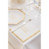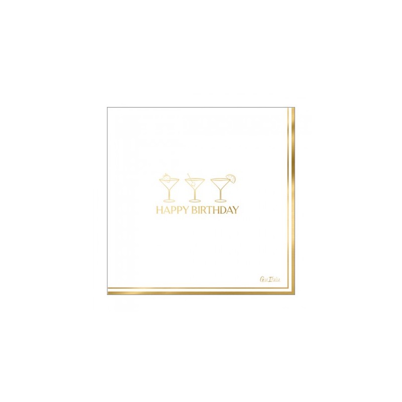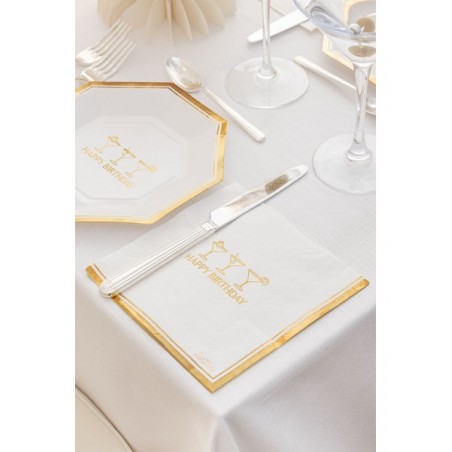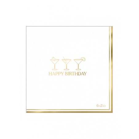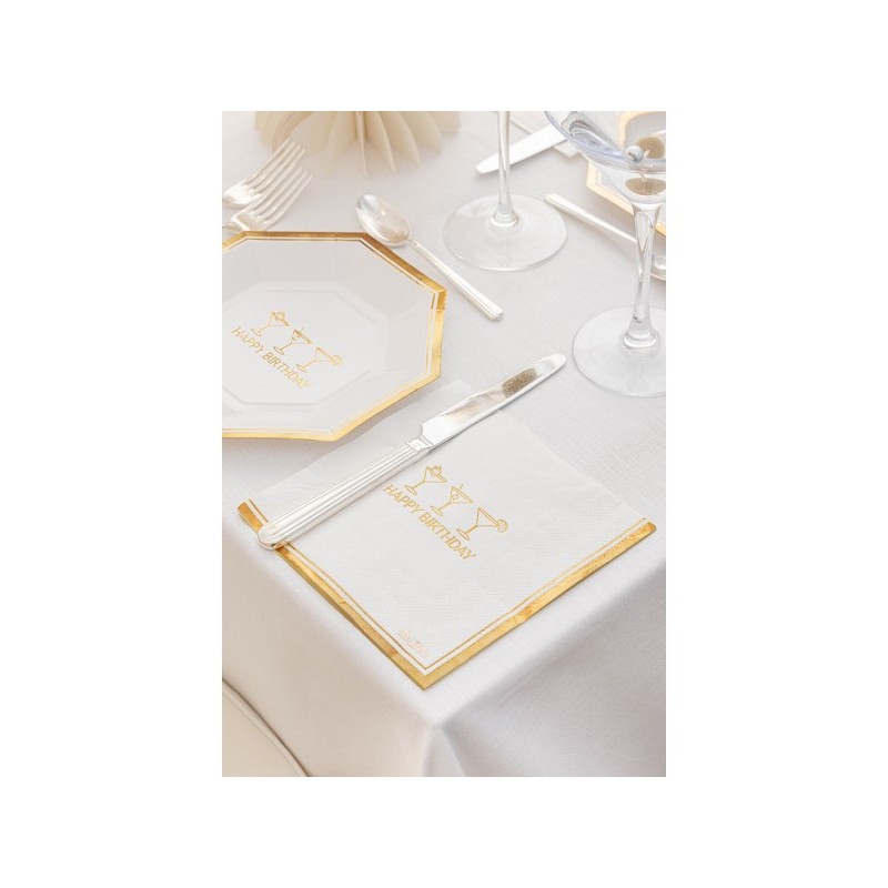Il coordinato Happy birthday cocktail è un piatto ottagonale in carta bianca, dal design elegante e contemporaneo, pensato per le occasioni speciali. La superficie è bianco puro ed è incorniciata dalla forma ottagonale che dona carattere e raffinatezza. Al centro del piatto spiccano tre bicchieri da cocktail stilizzati, disegnati con linee essenziali e armoniose, realizzati in oro luminoso che cattura la luce con discreta eleganza. Sotto la scritta “Happy Birthday”, anch’essa in oro brillante, rende il piatto festoso ma sofisticato, perfettamente bilanciato con il motivo decorativo. L’insieme crea un contrasto raffinato tra il bianco minimal e l’oro prezioso, rendendolo ideale come elemento decorativo, piatto da portata per feste o idea regalo di compleanno dallo stile chic e celebrativo.