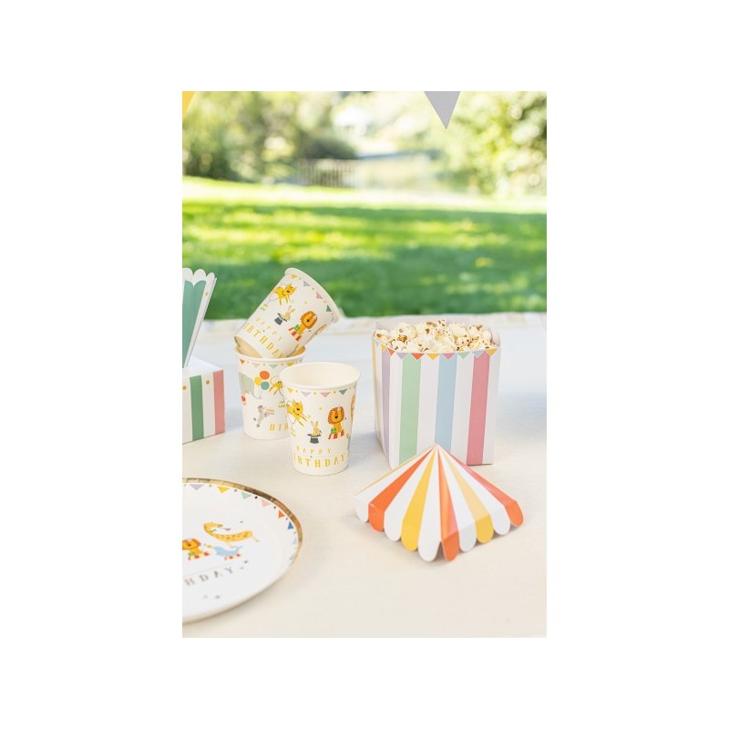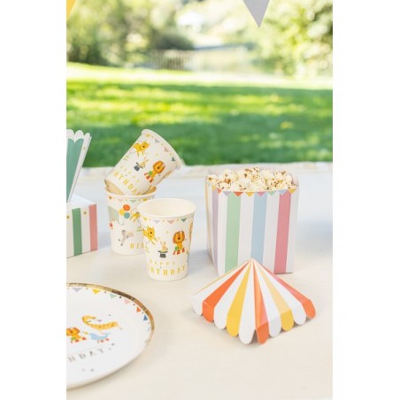 Party boxes a righe con coperchio, pratiche e colorate, ideali per regalini, dolcetti o piccoli gadget durante feste e compleanni.