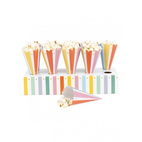 Porta coni rettangolare in cartoncino completo di coni in carta, perfetto per servire dolcetti, popcorn o snack durante feste e compleanni.