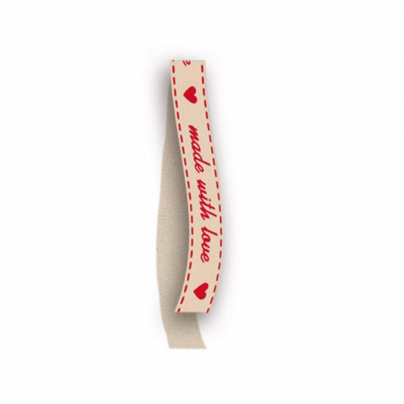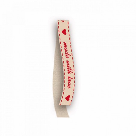 Nastro in cotone tinta naturale, con stampa serigrafica di cuoricini che si alternano alla scritta “made with love”.