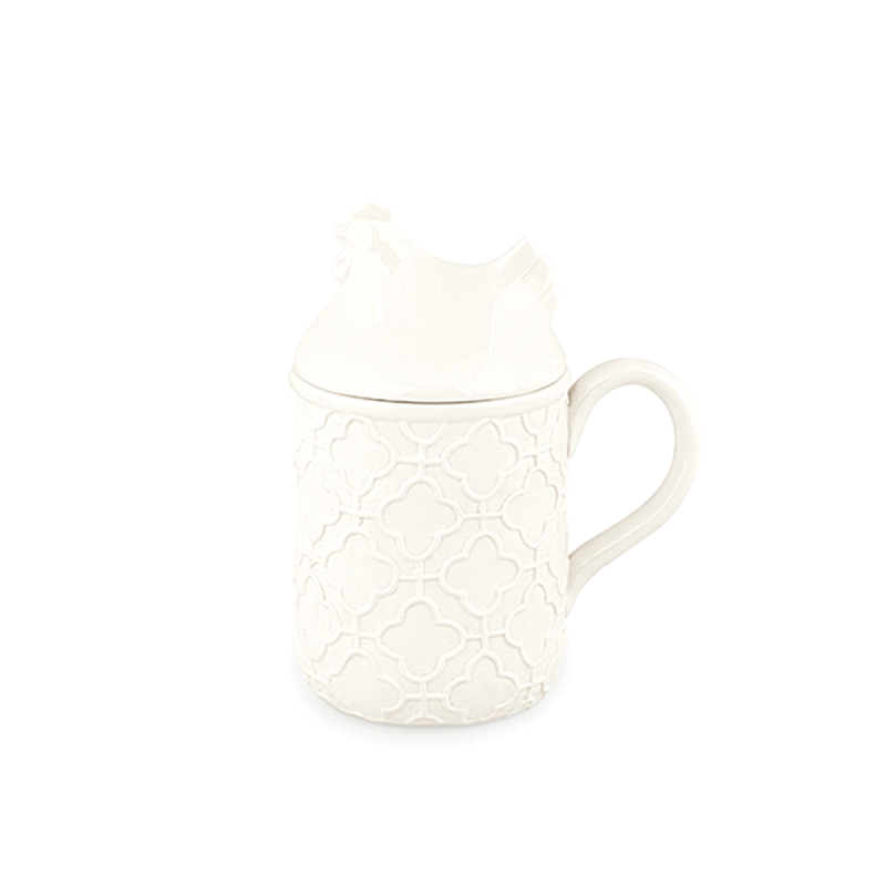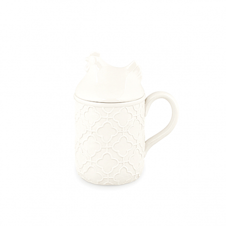 Tazza di colore bianco con decorazioni e coperchio a forma di gallina.