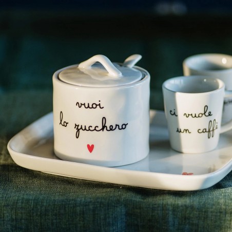 Zuccheriera in grès con cucchiaino e scritta "vuoi lo zucchero".