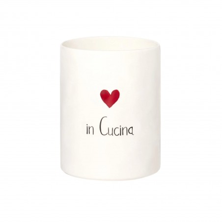 Porta mestoli e posate in gres bianco con cuore rosso e scritta "In cucina"