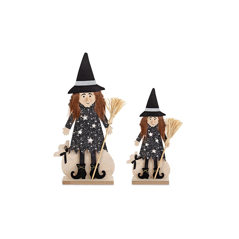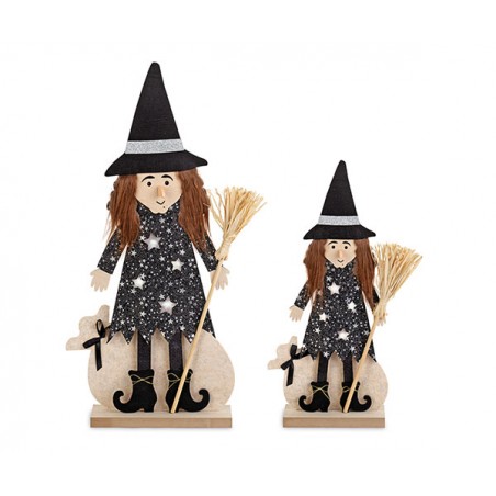 Set di due befane con base di legno e LED luminosi
